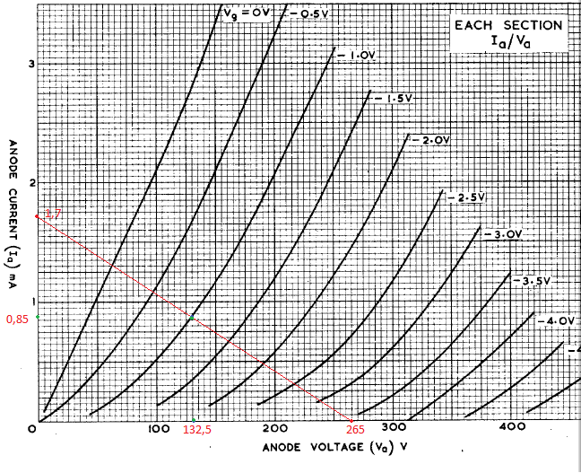 Ezekből azt számoltam ki, hogy az anód ellenállás 265V/1.7mA azaz 156kOhm, a katód ellenállás pedig 1V/0.85mA azaz 1.17kOhm.
