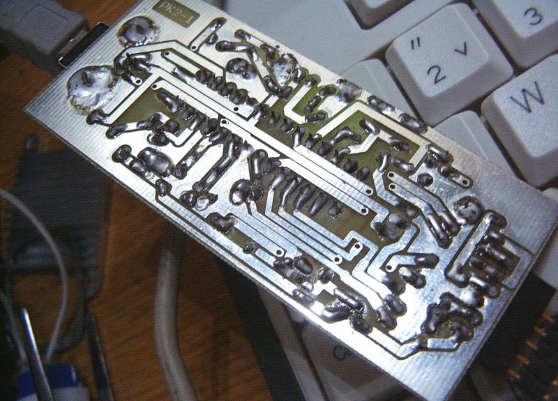 Mondjuk szerintem az nem látszik hogy furatgalvánozott-e vagy nem, csak, hogy kétoldalas. Mondjuk a furatok precízsége és a szép ónozás miatt gyártatott panelre tippelek (csak nincs lötstop réteg).