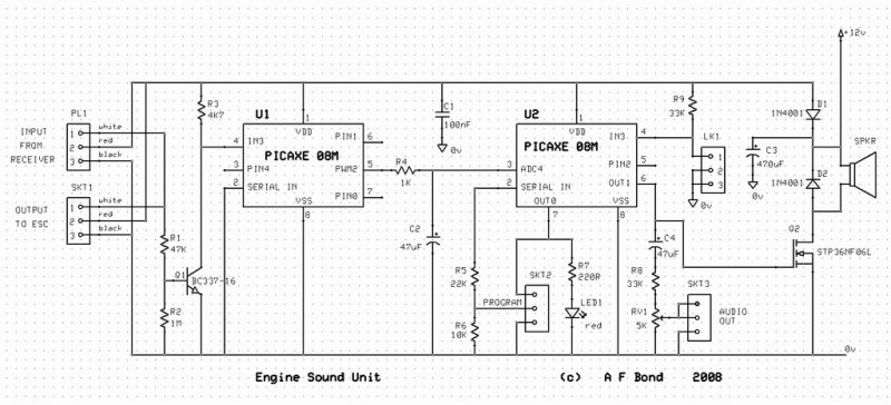 Nem akartam új témát nyitni, talán ide is belefér. Segíséget szeretnék kérni a PICAXE microkontroller, más hobby-ágban való alkalmazhatóságához. Egy angol modellhajó-építő klub elektronikával foglalkozó tagja, 2008-ban ,három (benzin, diesel, gőz hajómodell mozgásarányos hangeffektjét előállító picaxe 8m-el megvalósítható áramkör leírását tette közzé . Bővebben: Link A hajótestbe épített hangmodul, a működtető berendezések szervóival együtt, távírányítással működik. Az én problémám is ebből fakad. Szeretném a hangmodult analóg vasútmodellezésben alkalmazni. A vonójárműben lévő DC motort működtető,váltózó értékű feszültséget kellene szinkronba hozni a programban lévő hangelemekkel. Az eredeti PCM működtetésű kapcsolást mellékelem. Segítségeteket előre is köszönöm ! A hozzászólás módosítva: Dec 27, 2012