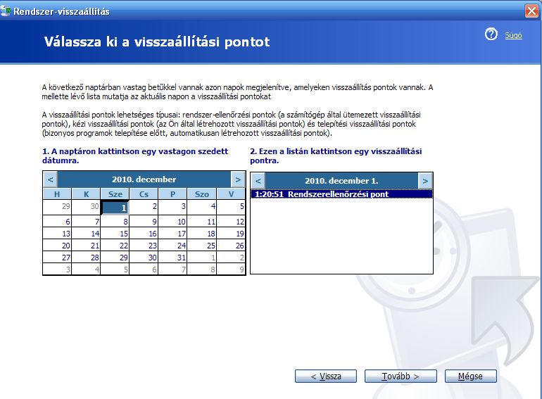 Start>Kellékek>Rendszereszközök>Rendszer-visszaállítás ,és ott nem a Rendszer visszaállítások beállítása hanem a jobb oldalon lent a "Tovább" gombra klikk.