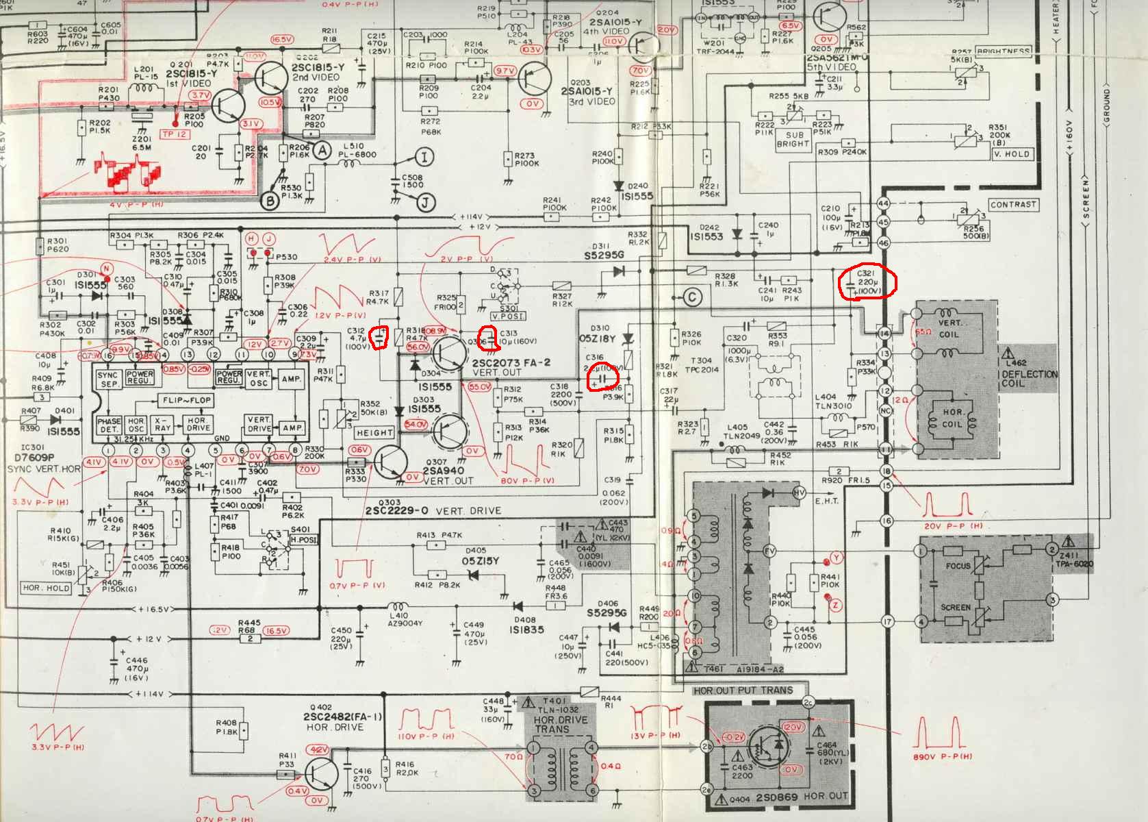 Biztosítékok rendben. Függőleges eltérítőnél minden OK. Mindent portalanítottam, égésnyom nincs, "amperszagot" sem érezni, a kondik is épnek tűnnek. Minden normális. Ellenállásokat és a diódákat kimértem.
