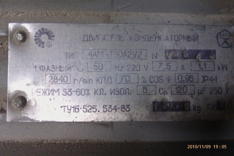 Lehetett sejteni a 120 mikrof-ból.hogy kb 1 kW körüli. Indítókondenzátornak ökölszabály szerint 70 mikrof/kW -ot szoktak tenni. Az adattábla szerint is ez egy 4 pólusú (a tipus szám első karaktere),ebből következően 2800/min fordulatú 1,1 kw-os,kondenzátoros motor. A szigetelési osztály:B A szükséges kondi adata jól látható az adattáblán. A C1-C2 (oroszul a sztátort jelenti a cirill C karakter)-kapcsokra kössél 220 voltot egy ampermérőn keresztül! Az áramfelvétel nem lehet több üresjárásban 1-3 ampernál.Ha több, kondi nélkül ki kell mérni a tekercseket menetzárlat szempontjából. A kapcsoló majdnem biztos,hogy indítnyomaték miatt egy kondicsoportot bekapcsol,majd leveszi a kapcsokról.