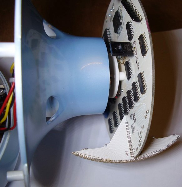 Én még mindig afelé hajlok, egy olyan széles nyákcsíkra tervezném az elektronikát, ahol elférnek a ledek és a vezérlőáramkörök is. Természetesen olyan ívben való meghajlítással, amit még elvisel a nyáklemez, de elegendő a gömb méretéhez. Ezután felforrasztva a felületére az alkatrészek. Megfelelő közép merevítéssel kialakítva, lehetne kidolgozni a stabilitását is. Így viszont alig lenne légellenállása a forgó mechanikának, mert nem "lapjában kavarná" meg a levegőt hanem az élével.