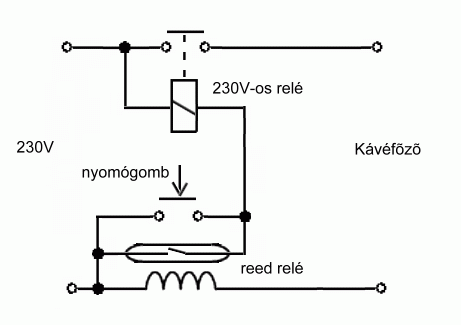 A tekercset úgy kell méretezni, hogy a kávéfőző fűtésének áramára behúzzon a reed relé, ha kikapcsol a fűtés, akkor engedjen el.