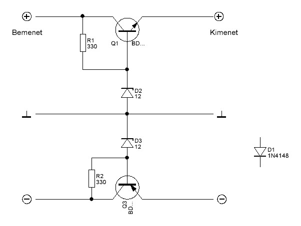 A segítségetekre lenne szükségem! Van egy erősítőm amiben a végtranyók igen csak ki vannak hegyezve(bd249c-250c) mert +/- 112v-ról fut. Van valakinek valami ötlete hogy hogyan tudnám a tápot csökkenteni vagy szabályozni? arra gondoltam hogy MJ15022-MJ15023 (ez van itthon)és két db 100v-os zenerrel valami hasonló módon megoldható, mint a mellékelt fájl? ....elörre is köszi!!!