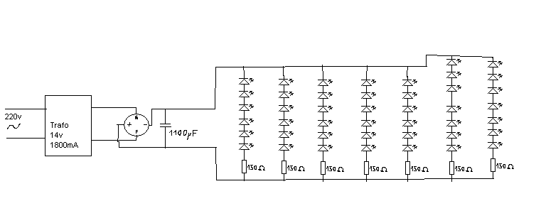 Szeretnék müködtettni 44 drb. zöld 5mm egyszerü ledet egy 14v ,1.8A trafoval és szeretném kérdezni ,ahogy lerajzoltam ugy müködne ? milyen tipusu stab ic -et használjak hogy megbirja? és milyen ellenálast hogy elég jol világitsanak?