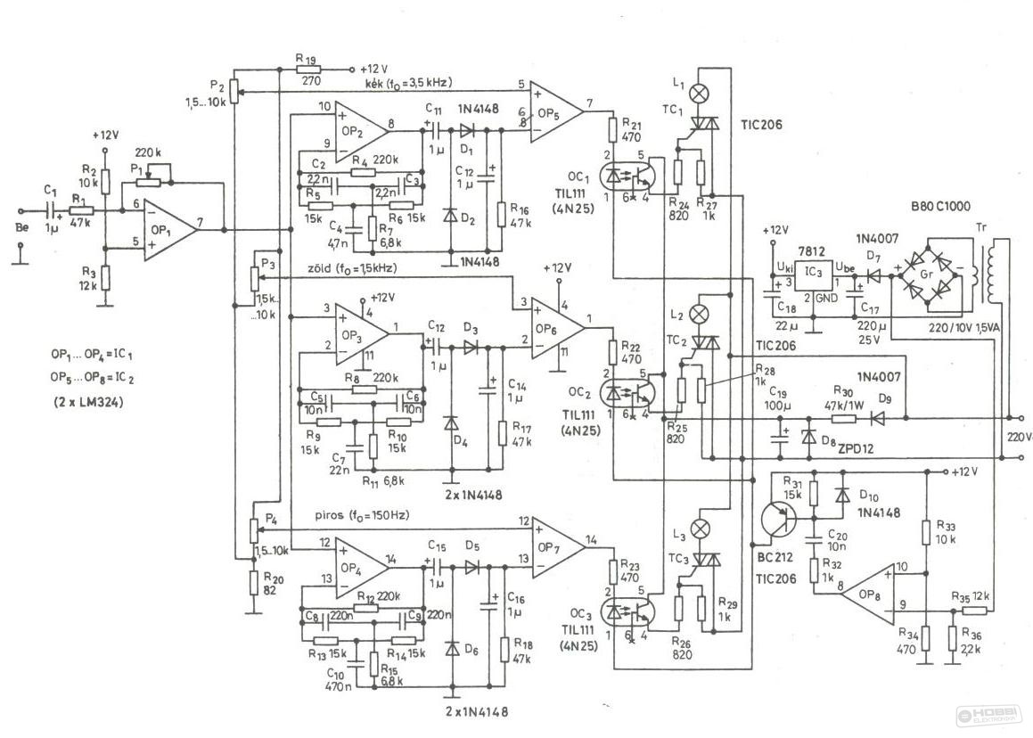 ( A szűrőáramkör tesztelésénél is 12V AC-ról tápláld a kapcsolást! Ha DC-t kötsz a GRAERZ elé akkor a mullátmenet vezérlés nem fog működni és ezért a kontroll LED-ek sem fognak világítani. De az a gond áthidalható a T1-es tranzisztor rövidrezárásával. ) Kezd a stabilizátornál, majd minden IC csatlakozóban is mérd ki a tápfeszültségetek. Ha az rendben van, akkor a Ellenőrizd az R2 - R3-as feszültségosztón a feszültséget. Ott közel fél tápfeszültségnek kell lenni, mert nem egyforma a feszültségosztó ellenállásai. Ezután a potenciométereket ellenőrizd! Ha ott is rendben van minden akkor csak a kontroll LED-elet és az IC-ket kell polaritáshelyesen a foglalatokba dugni. S mehet a HF jel. Addig a 230V-os résszel ne is foglalkozz amíg a vezérlőpanel nem működik tökéletesen!