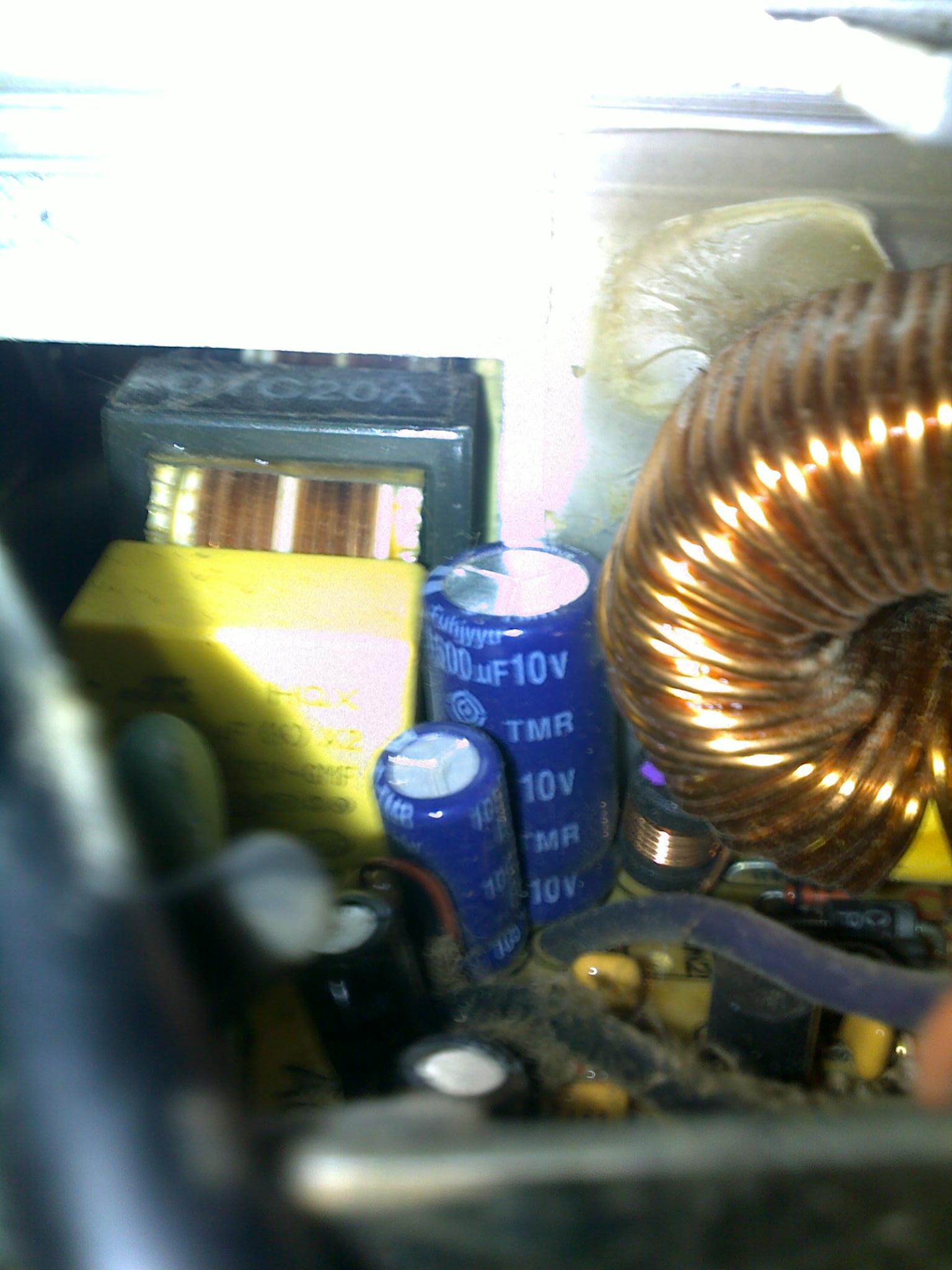 Egyfelöl a táp, amit ideiglenesen beraktam (Q-Tec) és kondikat cseréltem benne. Mi a frászt kerestek 10V-os kondik (gyárilag) a 12V-os ágon!? A másik, hogy tüzetesebben megnéztem azt a tápot, ami eredetileg a gépemben volt (Coolink AP-400X). Ez az, amelyik kikapcsolgatott, majd végül már nem indult a gép. Ez a táp a Prohardveren Didyman "nem ajánlott" listájában is szerepel, talán nem is a veszélyessége, mint inkább a megbízhatatlansága miatt: "Coolink APxxxX széria (gyenge készenléti kör, kondenzátorok)" Szóval ebben vannak púpos kondik. Mindegyik a kimenő ágaknál van. 3300µF-osak, 10 és 16V-osak (a 16V-osak a 12V-os ágon). Természetes jó tápgyártókhoz méltón fűtött helyen vannak, nehogy megfázzanak. Képeket csináltam, de ott már úgy látszanak, hogy a dzsungel felét lebontottam, hogy egyáltalán látni is lehessen valamit. A +5VSB ugyebár egy lila vezeték, ami nem erről a szakaszról indul ki, hanem befut a táp közepére. Ott van egy kondi, de egyelőre nem látom tisztán az értékét. Talán 1500uF. A 3. képen az látszik.
