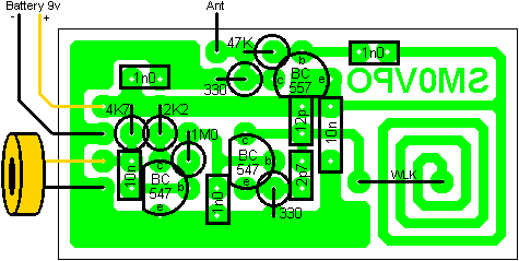 Itt az én példányom ,trimer kondival hangolható. Az ellenálások nálam a fóliázott oldalra kerültek mert smd -ket használtam.