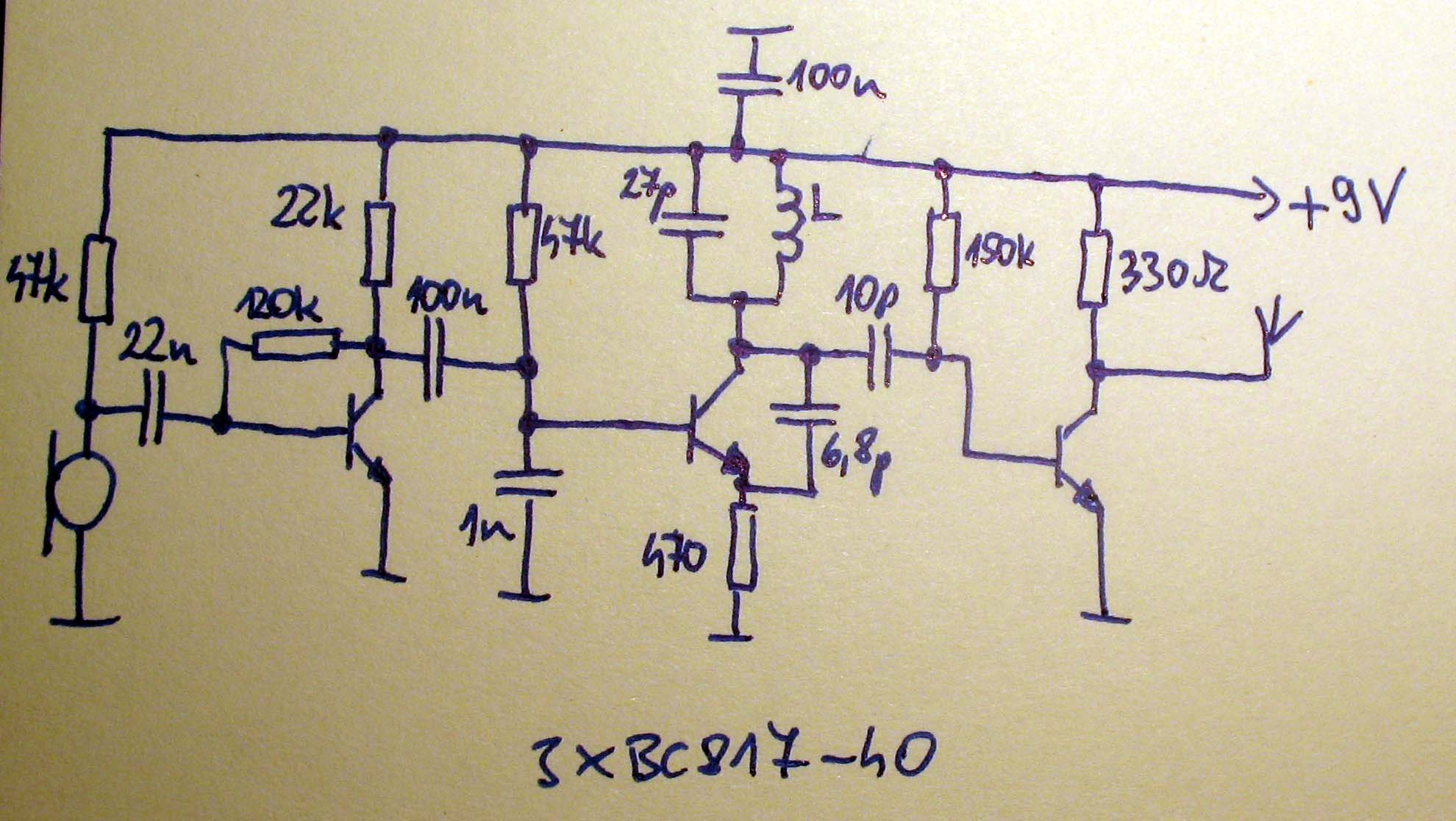 Én is építettem jópár darab ilyen FM adót, BC817-40-es tranzisztorokkal, lényegében hasonló kapcsolás mint ez (egyetlen rezgőkör+leválasztó fokozat), és nyílt területen egy rádiós walkmannal én is több, mint 200 méteres hatótávot értem el. 9V-os elemről táplálva, 13 mA-es fogyasztás mellett, és 80 cm-es drótdarabbal antennaként.
