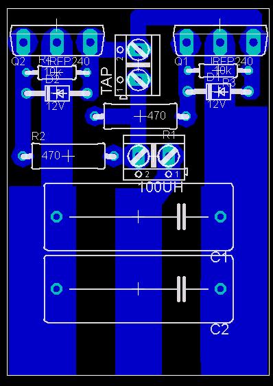 Valamelyik nap kipróbálok egy nyáktervet a zvs-hez. A nyákon a gyors diódák nincsenek rajta, azt közvetlen a FET-ek lábára kell ráforrasztani. Ha érdekel valakit, majd felrakom a végső nyáktervet. A primer tekercshez a kivezetés a 3 rézsáv a nyákon lent.