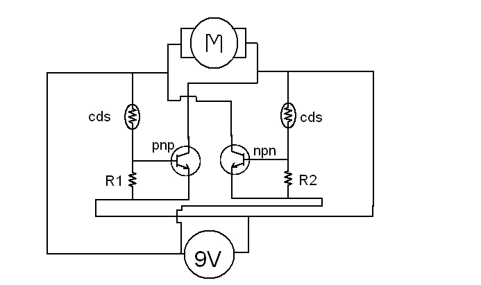 Ez a kapcsolás, legfőképpen semmire nem jó! Ha szépen megnézed a kapcsolást, és elindulsz az elem két pólusa felől, akkor láthatod (némi kerülőutakon) hogy a motor megkapja a 9V feszültséget. (Tehát állandóan forogna egy irányban) A tranyó meg csak a vezetéket zárja rövidre, ha a CDS-be érkező fény kinyitja mást nem tesz. Hát baj nem lenne belőle az biztos.. Számodra egy H-híd kapcsolás szükséges, amit a fényelemek kapcsolnak. De azt is differenciális jelleggel. (Tehát a két CDS megvilágítása közötti differencia mozgatná a motort, abban az irányban, ahonnan a fény erősebb.) Mert úgy gondolom, ez valami napkövető lenne, ha felnő.. üdv! proli007