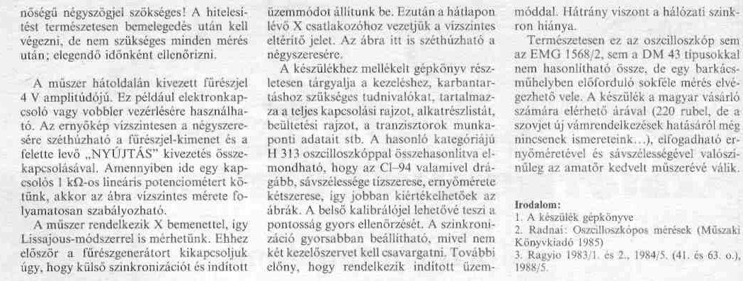 Szert tettem egy C1-94 típusú orosz szkópra. Akinek van/volt szerencséje a típushoz, árulja el legyen szíves, hogy a hátulján a 4 db banánhüvely mire jó? Mit lehet oda csatlakoztatni, illetve mit nem szabad? Pl.: van feszültségkorlát, vagy ilyesmi? A triggerelés sem teljesen tiszta, mert ha a bemenetére adok egy sinust, és a trigger gomb auto módban van, akkor úgy tudok álló jelet csinálni, hogy több sinus van egymáson pár milliméter eltolással. Ha nem auto módban van, akkor meg nincs jel, amíg nem tekerem a trig levelt olyan állásba, amilyennel már tud triggerelni, tehát nem látom a futó jelet sem a képernyőn. Van olyan kombináció, amikor a trig levelt automatikusan állítja be, és nem kell a potméterrel játszani értékelhető jelhez? Vagy az enyémnek rossz a trigger fokozata? Előre is köszi. Schnitt