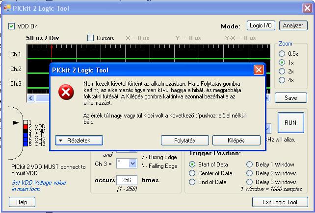 Egy kis hiba a PICKit2 logikai analizátor programjában. A kép felirata szerint 1..256 értéket lehetne megadni, de az adat csak 1..255 lehet a byte .os változü miatt... Az "occurs" mezőbe írj kisebb számot... (1..255) ..
