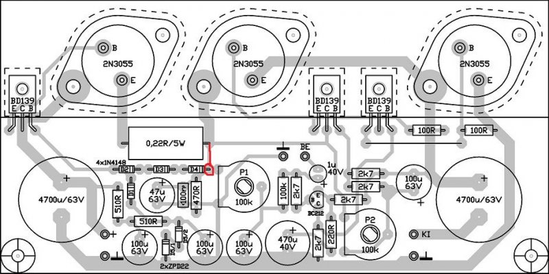 Idézet: „Szerintem a 470Ω-os ellenállást kicserélem 10w-osra mert ez eszméletlenűl fütt.” Nem értettél meg. Ne 10W-osra cseréld, hanem vedd ki. NEM KELL oda, ha az erősítő rajta van. Vagy ha mindenképpen ragaszkodsz hozzá, akkor cseréld ki 10k-ra, ami nem fog melegedni.