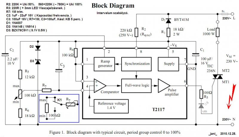 A módosítással a villogás kitöltési tényezőjét lehet időzítve "átúsztatni", mivel én izzóval próbáltam. C1 : 100µF 16V. Vele párhuzamosan egy BZX 9V1 + 1N4148. C2 : 1µF-22µF 16V. C3 : nem tesztelt. R1 : 18K 2W ( enyhén melegszik. ) R2 : 220K ( + sorba vele egy 1M ohm -os trimer. Trimer nélkül a kimeneti feszültség a terhelésen ( OHM -os trehelés!!! ) csak KB 115V AC. Az 1M -ohm -os trimer középállásánál jelent meg a 230V AC a terhelésen. Közte szabálytalan villogás volt tapasztalható. R3 : 200-220 ohm. Még tökéletesen begyújtott a triak. 100 ohm alatt ( 50 ohm ) az áramkört " lefogja". R4 : 100K R5 : 12K R6 : 18K Pmin-max : 100K R7 : nem tesztelt. D1 : 1N4007 Triak : TIC236M FONTOS! A triak MT1 MT2 felcserélése az IC-t tönkre teheti! ( 100 ohm -os gate ellenállásnál! ) Hibátlan L2117-esnél a C1-en 9.1V - 9.8V közötti feszültség mérhető. A C1-el párhuzamosan kötött 9.1V 500mW-os zéner + az vele sorba kapcsolt 1N4148 inkább csak védelem, ha véletlen IC nélkül lenne, áram alá helyezve az áramkör. Ha a C1-en 9V alatti feszültség mérhető akkor az IC részben vagy teljesen meghibásodott. Jó kísérletezést!