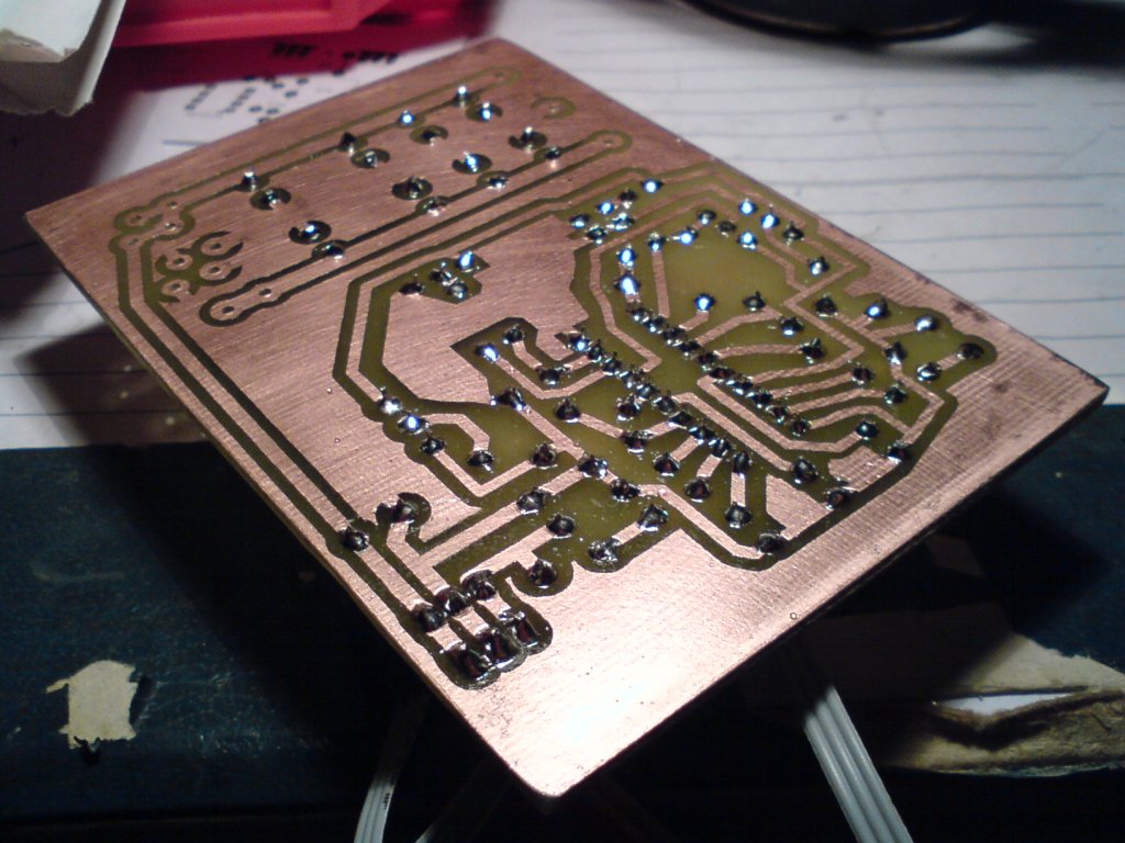 A kimart panelt egy ecsettel bekenem fluxxal és pákával végigfuttatom a vezetősávokat sima 0.8-as ónhuzalt használva. Macerás minden vezetősávot egyesével végigfuttatni, de a kémiai ónozóval hiába próbálkoztam, nem sok köze volt annak az ónozáshoz...