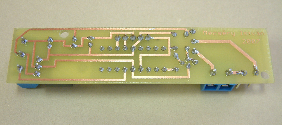 A lakk előtt jó alaposan meg szoktam súrolni, amíg szép fényes nem lesz, majd csak a maratás és a fúrás után mosom le a lakkot, akkor újra megsúrolom. Ezután forrasztólakk, forrasztás, a forrasztólakk és a folyasztószer letakarítása alkohollal, vízzel és körömkefével, súrolószert ilyenkor nem használok, mert attól matt lesz a forrasztás. Amikor teljesen megszárad, lefújom akril lakkal. A fotólakkom már egy kicsit öreg, szerintem ezért tűnik „cakkosnak” a sávok széle, amit az akril csak jobban kiemel Egyébként, szerintem nagyon macerás a fotózás, régóta csinálom, de bizony előfordul, hogy előhívás után kezdhettem előröl az egészet, ez kétoldalas NYÁK-nál igazán őrjítő. |