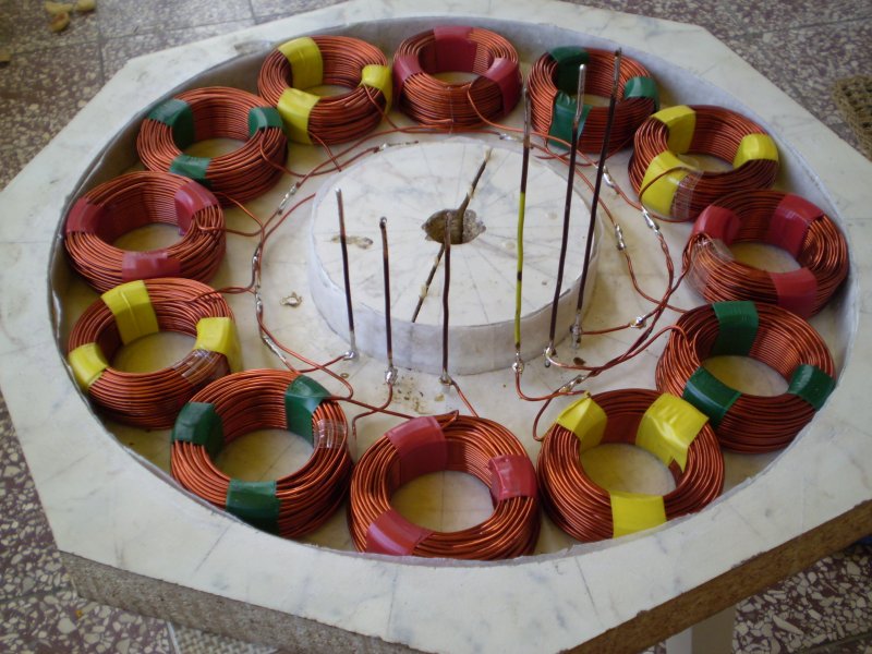 A Hugh Piggott féle generátornál a nagyobb rotor,ill sztator átmérő nagyobb kerületi sebességet,ill. kissebb fordulatot jelent ugyanarra a teljeitményre.A tekercstömb kiöntése messze nem olyan bonyolult mint elsöre látszik.Egy megfelelő méretü és formáju sablonba elhelyezed a tekercseket,elkészited a bekötéseket,utána jöhet a kétkomponensü poliészter beöntése.Kissebb,ill közepes méretü generátorhoz böven elég 1, 1,5 kg.-nyi poliészter,csak a reaktivbol(bután) tegyél 15,-20 százalékkal kevesebbett az ajánlottnál,igy lassabban köt,és föleg nem fog repedezni.Másféle lakkal nem érdemes kisérletezni,nekem legalábbis ez vált be a legjobban.Az ,,,átlapolás,,, nem jó mert csak nagyon vékony drottal lehet tekerni,ami nagyon megnöveli a generátor belső ellenállását.Egy jol megépitett generátorba csak annyi anyagot kell(tekercset) kell beépiteni,amennyi feltétlenül szükséges a jó müködéshez.A mindenféle felesleges tulméretezés csak kolonc a generátor ,,,nyakán,,,