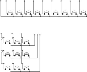 van egy sor nyomógombom - 9db és minden gomb egyik fele közös, másik fele egyesével kivezetve - azaz 10 kivezetés (felső rajz)