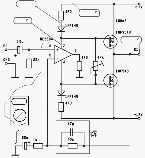 Csoda akkor történne ha valami amit én csinálok elsőre működne na az nagy csoda lenne. Fogtam a másik még "érintetlen" végfokot, eltekertem a potit 47K állásba, ráadtam a tápfeszt, megmértem az egyik 22 Ohm-os ellenállást és 10 Voltot mutatott a műszer és melegedett az ellenállás de nem annyira mint az előbb. 14-nél ugyan kevesebb de még mindég nem 2 Volt. A FET-eket megmértem, egyik láb sem vezet a másik irányába tehát jók. Mi legyen?