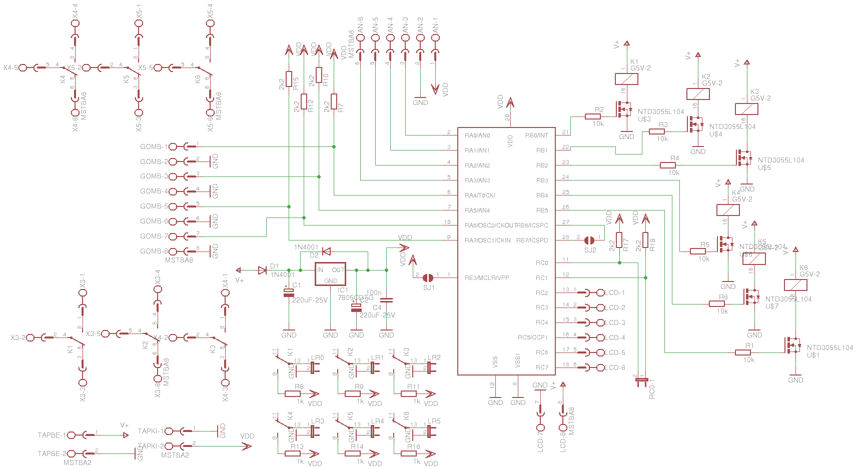 Jelentem, Omron G5V2-12V mini beforrasztható 2-áramkörös Morse reléket; névleges üzemi árama 41,7 mA (288 Ohm); illetve NTD3055L104 típusú power N-feteket.