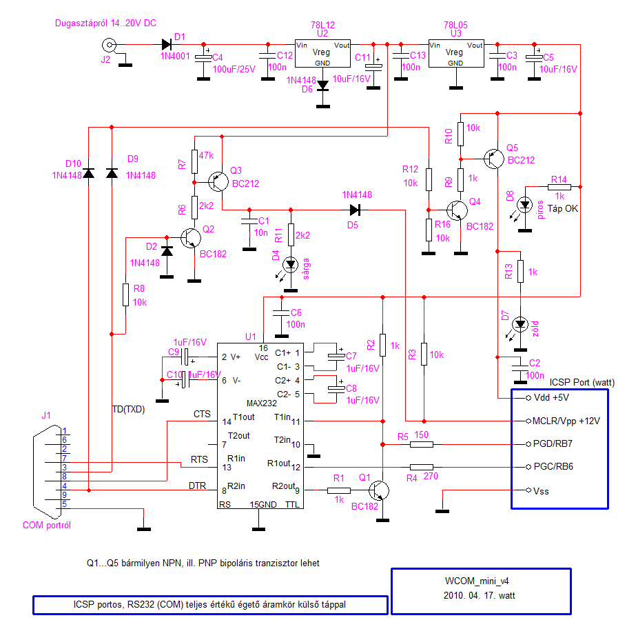 A nyákon egy hibát látok eddig, az pedig az IC 6. lábán a kondi, ami fordított polaritással van rajzolva a terven. E miatt valószínű, hogy a MAX232 nem fog működni.