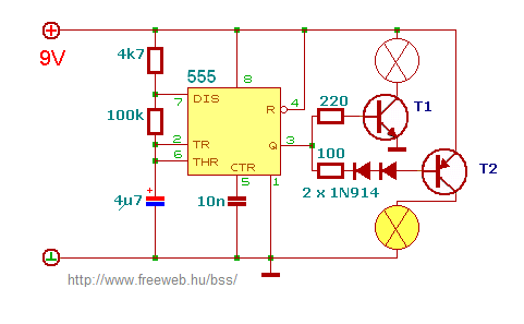 Az alábbi kapcsolásban levő izzók helyére jönnének a ledek szív alakban. Viszont amivel gondban vagyok, hogy az 555 kimenetén mitől függ, hogy mekkora ellenállások kellenek, illetve miért kell 2 dióda a PNP tranzisztor elé?