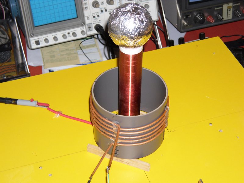 A tetőkapacitást valóban több különböző alakú testtel próbáltam kialakítani. Ezek között volt kisebb és nagyobb gömb, hengeres test, tárcsa, kúpos test és ezeknek különböző kombinációja. A megfigyelés az volt, hogy a kisebb testeknél halvány koronázás volt megfigyelhető általában az élek mentén. Egyedül a legnagyobb kb. 9 cm átmérőjű gömbnél (illetve az 5 cm gömb + hengeres test kombinációjánál) volt olyan, hogy intenzív ívek alakultak ki a primer és szekunder tekercs között.