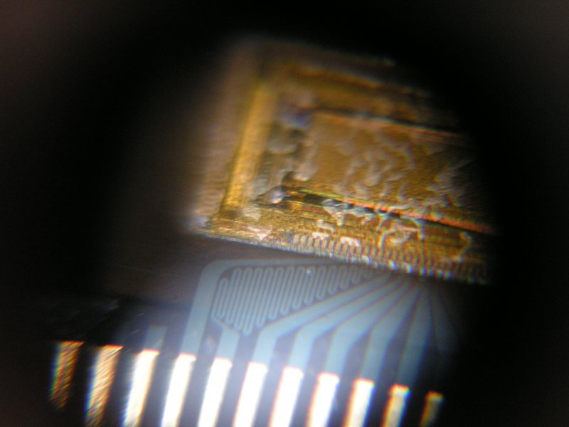 Megvizsgáltam nagyító alatt a külső kijelzőt hátha találok rajta valami írást amit nem vettem észre és egy furcsaságot találtam rajta. Az LCD csatlakozó vezetéke és a vezérlő chip közé nyomtatott egyik vezető sáv eltér a többitől (Lásd lejebb). Nem tudom hogy jelent-e valamit de én ilyet eddig csak a régi nokia töltőm panelén a negatív kivezetésnél láttam.