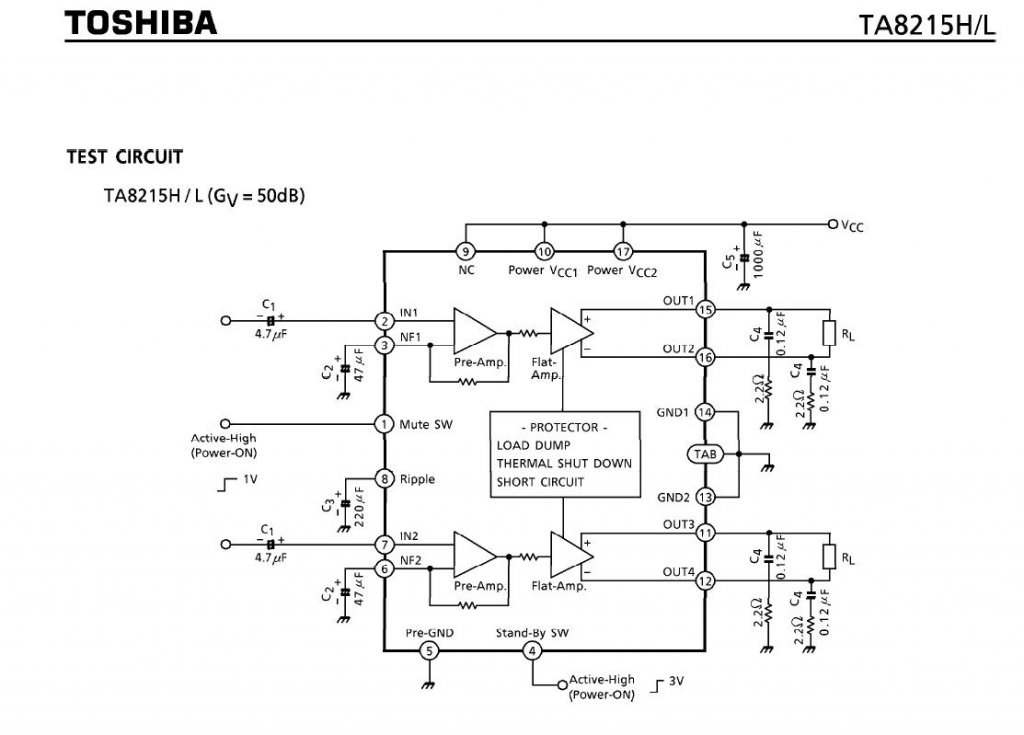 Innen letöltheted az adatlapját és abban van egy ajánlott kapcsolás. A rajzon a hangszórók ellenálásként vannak rajzolva.Bővebben: Link