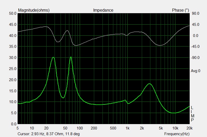 A képen jól látható , hogy ez a hangszóró pl ha 70 Hz es hangot sugároz akkor 54 ohmos, de ha pl 350 Hz -et nézzük akkor ott lehet akár 4 ohm is. Ez a pont a hangszóró impedancia minimuma , ezt célszerű figyelembe venni az ilyen jellegű számításoknál. Vannak olyan hangszórók amiknek ez a pontja jóval 4 ohm alá megy és ha pl 2 olyan hangszórót kötünk párhuzamosan aminek pl 3.2 a imp minimuma akkor bizony nem 2 ohm-os terheléssel kell megbirkózni az erősítőnek hanem 1.6 ohm-al. Azt is fontos megjegyezni , hogy az impedancia menet bedobozolt hangszórónál teljesen más, ezért a kész hangsugárzó impedancia menetét célszerű vizsgálni.