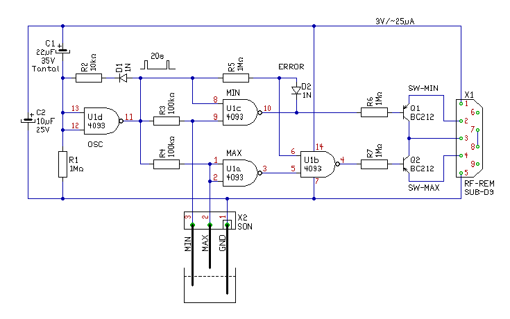 Számomra kissé zavaros, amit a működésről írtál. Próbáld meg a folyamatot pontokba szedve leírni a működés logikáját. Akkor kialakítható a szükséges logikai hálózat. (Bár az a PLC-n is nevetve megoldható) De nézd meg ezt, hátha profitálsz az elgondolásból. Hasonló problémát oldottam meg, zsomp vezérlésnél. Az áramkör egy konnektoros távkapcsolót működtet és kapcsolja a szivattyút, pontosabban a távkapcsoló nyomógombjainak "rövidre zárásával". A szondák itt nem úszókapcsolók, hanem galvanikusak. Vagy is a vízbe lógó UT18-as lánghegesztő pálcáról van szó. A készülék tápellátását is maga a távirányító 3V-os eleme adja. Kb. 20 másodpercenként megnézi a vízszintet, és ha a szint a maximum felett van, elindítja a szivattyút. Ha ezek után a minimum jelzés van leállítja. Ha a szint nem változik, akkor 20 másodpercenként újabb indítási vagy leállítási impulzust ad. A 20 másodperces figyelés spórolja az elemet, és jelentősen csökkenti a szonda áramát, mert arra csak 0,2sec ideig ad feszültséget. üdv! proli007