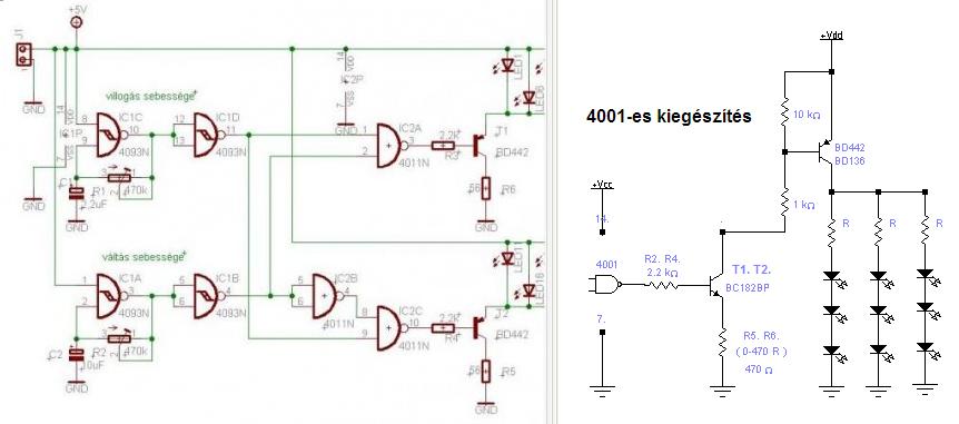 1: A 4093-as ( IC1 ) D, B, kapuját a kimenet invertálására is fel lehet használni. Az A, C, kapu kimenetén digitális jelszint van. S képes a 4011-es logika meghajtására. Sajnos a nyákot kicsit át kell alakítani. 2: Ki kell cserélni az IC2-őt 4001 NOR IC-re. A 4001 láb kompatibilis a 4011-el! Így a meglévő kész áramkörön semmit nem kell módisítani. Illetve. Csak a kimeneti tranzisztort kell NPN-s darlingtonra cserélni. Vagy az mellékelt PNP-s kapcsolást kipróbálni amennyiben már megvannak a PNP-s teljesítmény tranzisztorok.