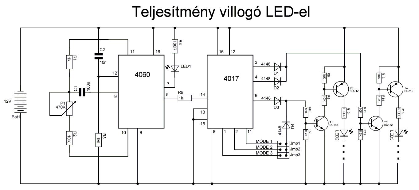 4017-es villogó, teljesítmény LED-el. Jó szórakozást.