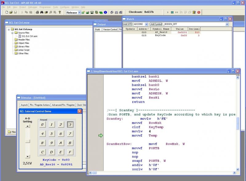 Billentyű mátrix kezeléséhez szerettem volna stimulust készíteni, de a MPLab -beli lehetőségekkel nem igazán tudtam elérni a mátrixba kötött gombok kezelését. A Microchip fórumán találtam az alábbi SCL nyelven írt stimulust, amivel a 16 gombos billentyűzet és a 16F88 AD egy csatornájának bemeneti értéke a képernyőről állítható. A mellékletben levő programhoz kell készíteni egy projectet, MPLab Szinulátort kiválasztani debuggernek. A "Simulator Settings" menüpont "Animation / Realtime Updates" fülén engedélyezzük a "Realtime watch update" -t, és 100ms -re állítsuk be. A Stimulus létrehozásánál az "Advanced" gombot használjuk, és az "Override Workbook with Stimulus file" mezőbe importáljuk be a SCL Ext Ctrl.scl állományt. Állítsuk be a "Watch" ablakban az AD_Res16 (16 bites decimális formában) és a KeyCode (8 bites hexadecimális formában) megjelenítését. Indítsuk el az excell-t az SCL Ext Ctrl.xls állománnyal, engedélyezzük a macro -kat. A kijelzés átvált a VB -kel létrehozott csúszkát és a 16 gombot megjelenítő ablakra. Indítsuk el a szimulációt... Ha a gombokat lenyomjuk, a KeyCode változó a gomb kódját fogja tartalmazni (0x00 ... 0x0F), illetve 0xFF -et, ha nincs lenyomva gomb. Az AD_Res16 változó értékét a csúszkával lehet változtatni. Az SCL egy nem (rendesen) dokumentált része a VHDL nyelvnek, felhasználásával a pic-en kívüli környezet is szimulálható. További részletek a Microchip fórum topikjában. Idézet: Nem bootloaderre gondoltam, hanem a panelre ráépített programozóra, ami mellesleg a hardveres nyomkövetést is támogatja. Az Explorer 16-on egy PIC18LF4550 csücsül, ami egy megbuherált PICkit2 firmware-rel megy, s a normál mód mellett a PIC32 mikrovezérlőt JTAG módban is kezeli. A PIC32 Starter kit-eken is vagy PIC18LF4550 vagy egy másik PIC32(!) a programozó/nyomkövető. „valami gyári panel fog szerepet vállalni, valószínű bootloaderrel.”