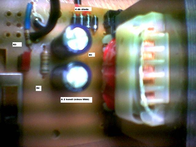 R-ek: R1 ki van szedve mert teljesen szetegett és nem tudok róla leolvasni semmit sem. R2:=546 ohm R3:=46 ohm 2 condi: 1000 mikro farad 25 volt ------------------------ a diodak pedig 0.631 nyitóirányu kapocsfeszultség 4db (biztos graetz) más aktiv elem nincs se egy tranyo ,se egy stab semmi tobb ezek