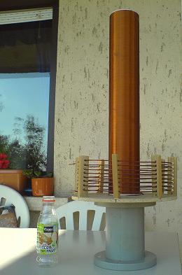 Hi, több hibát vélek felfedezni, az egyik az, hogy a szekunder alja túl magasan van a primerhez képest, így negyedakkora, vagy tizedakkora feszültséget fog indukálódni benne. 2. a tetőnél a szekunderre ráhajlított fémlemez (nem a korong) veszettül fog szikrázni lefelé befelé, meg minden irányban. A tetőkapacitás tartóját csakis szigetelőanyagból lehet elkészíteni. Az, hogy különböző huzalokból tekerted, az semmi jót nem jelent sajnos. Szerintem ha sorkimenővel próbálod meghajtani ez meg sem fog nyikkanni, de ne legyen igazam
