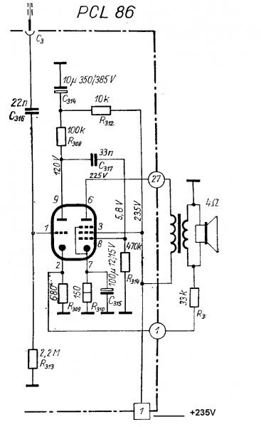 Sziasztok. Szétszedtem egy régi orion70 f.f-tv-t. Volt benne PCL86 és megépítettem. Könnyű dolgom volt ez volt a végfoka, szóval volt benne külön fűtéshez és külön a kimenőhöz trafó. (280v D.C-n megy.)Mellékeltem a kapcsolást, ami alapján csináltam. Egy bajom van az egésszel, hogy a mély hangokat nem hallom semmi zenéből. Mi lehet a baj szerintetek? A 9. és 8. láb közötti 33n kondi helyett 47n-t raktam be. Minden más adat egyezik. Amit mondtak rá 2-4 wattot azt kiadja