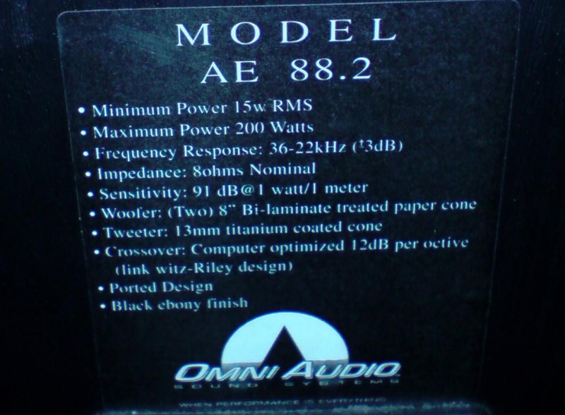 A frontjaim azok omni audio ae88.2 ,csináltam egy képet a hátulján lévő infókról.A többi hangfal 6db philips fw-r88.Ezekkel a philips hangfalakkal kapcsolatban is lenne kérdésem,remélem nem gond,hogy itt teszem fel.Van esetleg olyan 6,5" os jó minőségű relative olcsó hangszóró amire érdemes lenne kicserélni azokat amik gyárilag benne vannak és megfelelne nekik ez a doboz méret 35x24x31,5 cm?