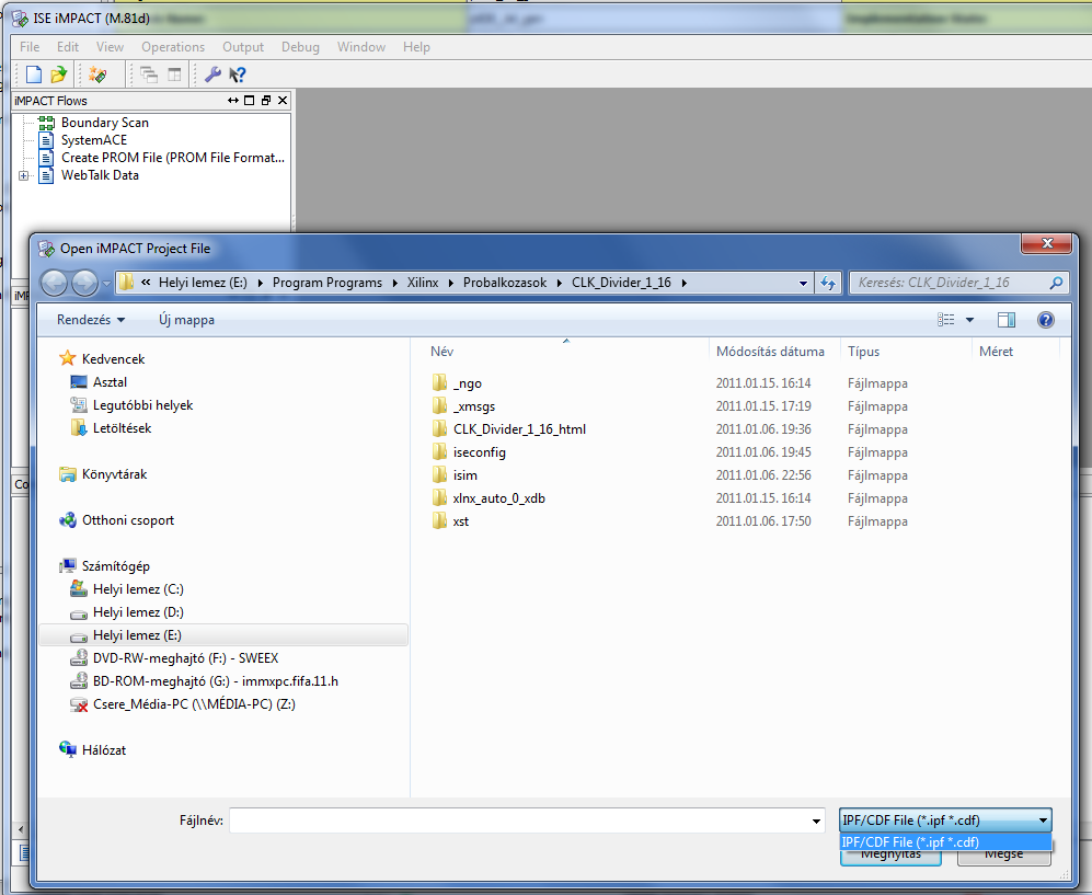 .bit nincs ? Én sem ismerem ezeket régieket. Én a jtaggal bit file-t szoktam letölteni. Az ipf az impact project file, az nem eszközbe való. A cdf Chain Description File, az sem jó betöltésre. Bit file lesz az szerintem.