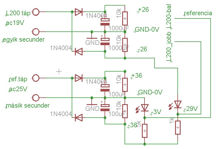 A két tápból szimmetrikus labortápot szeretnék készíteni, tehát sorba van kötve két L200. Az egyik táp +26V és GND közé lesz kötve, a másik pedig a GND és -26V közé (Ezek a feszültségek pedig lejönnek egy trafótekercsről egyenirányítás után). Ehhez kell az egyik tápnak -3V ref, a másiknak pedig -29V referencia feszültség. Eddig stimmel. A referenciához gondoltam egy nagyobb feszültségű trafótekercset felhasználni. Nem mehetne a két L200 azonos tekercsről? Potenciálkülönbség meg van az L200 tápjai között. Vagy valami ismét kimaradt a gondolatmenetemből? Köszi!