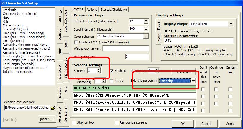 Ha azt akarod, hogy ha nem megy a winamp, ne mutassa a státuszát, akkor a winamp screen-en Winamp is inactive-ot állíts a Skip this screen if után.