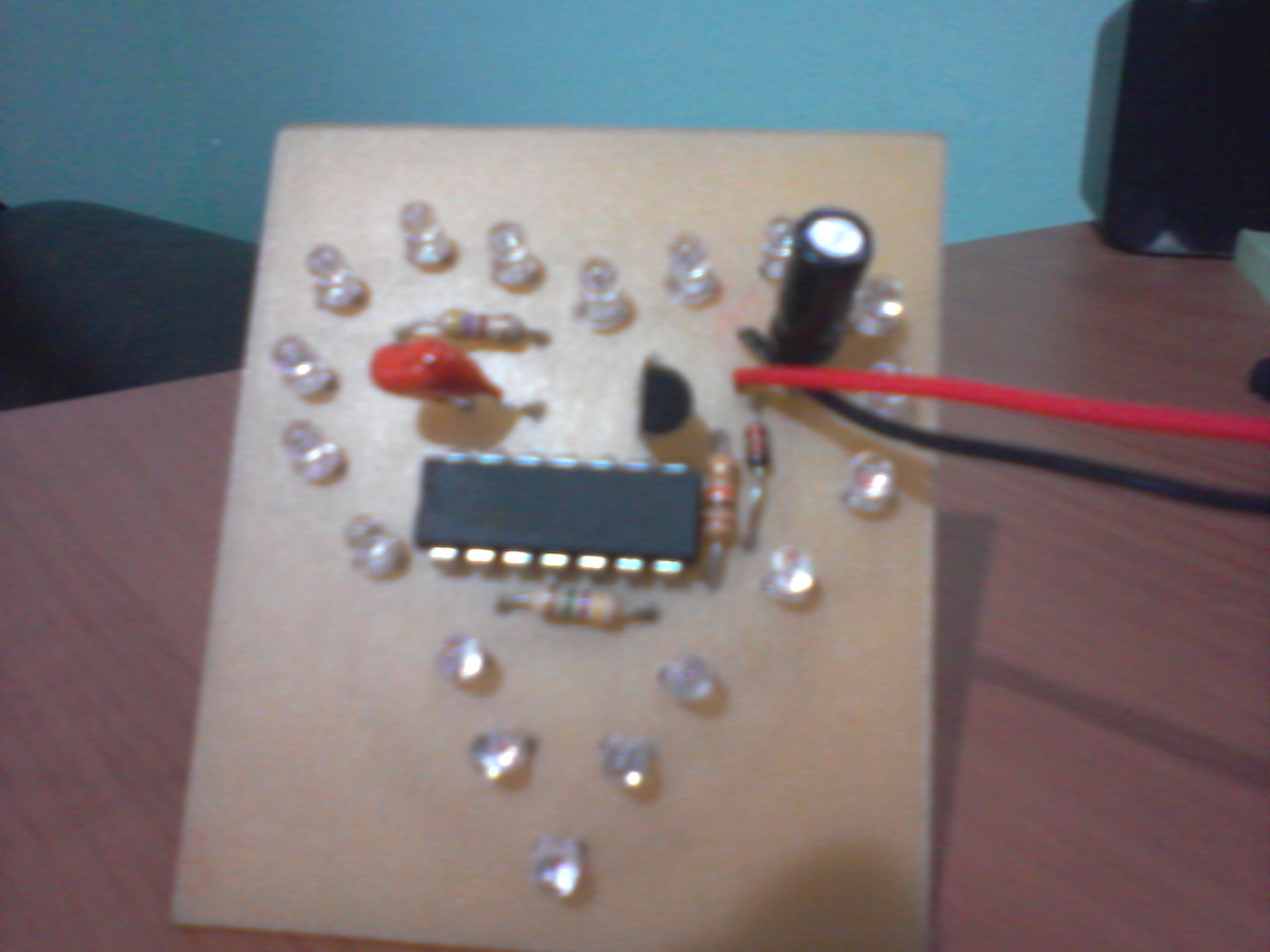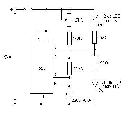 Az én LED-jeim, ha jól emlékszem 1000mCd vagy 1200mCd-lásak. Az előtét ellenállásokat lecsökkentetem én az eredeti 560R-ról 1R-ra a maximális fényerőeléréséhez! Ennek következtében a két szív villogásának sebessége drasztikusan felgyorsult, ezért két lehetőség közül választhattam. Az egyik hogy a két darab 33kOhm-os ellenállás értékét lecsökkentem vagy a két darab 2,2µF-os kondenzátor értékét növelem, mindaddig míg a számomra megfelelő villogási sebességet el nem érik a szívek! Én az utóbbi módszert választottam! Amúgy kondenzátorodnál a minimális 16V-os fajta tökéletesen megfelel! A képeket a szívekről hétfőn, mihelyt van időm feltöltöm! Üdv: Ármin27
