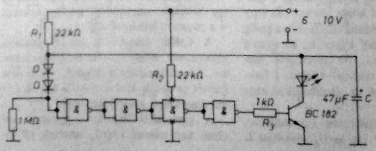Nem próbáltam még ki, de ez a leírás szerint egy nagyon takarékos villogó, miközben erős fényt ad le. Ami a szövegben nincs benne: IC: 4011, ne tapizd a lábait, mert érzékeny a sztatikus feltöltődésre. Csatoltam a bekötését, Udd a pozitív tápfesz, az Uss a negatív. A diódák bármilyen szilícium diódák lehetnek pl 1N4148, vagy 1N4001 - 1N4007 A kondenzátor legalább 16V-os legyen. Az egész mehet egy 9V-os elemről. Ha ez nem tetszik nézz körbe itt, ezek villognak maguktól, csak az áramot kell max 20mA-re korlátozni.