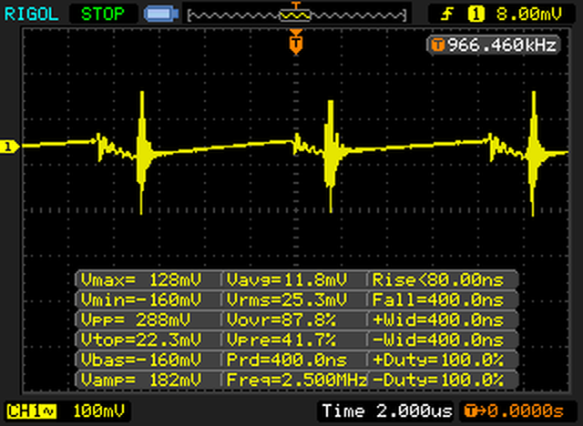 Mondom nem csinálja mindig. Van, hogy bekapcsolom, és semmi amíg ki nem kapcsolom, van amikor bekapcsolom, és végig csinálja. Ha kiveszem az induktivitást, akkor nem csinálja. Kipróbáltam 2uH, 10uH, 25uH, 650uH folytókkal, és mindegyikkel tudott így sisteregni. Skóp nélkül is csinálja. (mindig rapszódikusan)