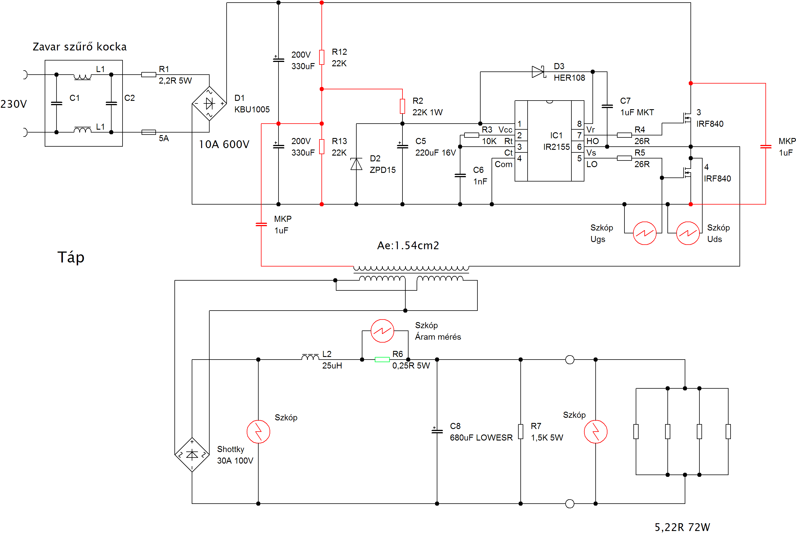 Általában csak utoljára érdemes foglalkozni vele, mert nagyon összetedt jelenség, és a jelenléte nem vezethető vissza konkrétan egy dologra. (Te valószínüleg az üzemi freki változását hallod, ami a nem megfelelő kivitel következménye.) Ahogy most bekötötted az áramváltót, úgy használhatatlan, mindenképp kell rá egy lezáró ellenálás, különben nem ad arányos/valós jelet. Egyelőre fölösleges a teljesítmény határoláson gondolkodni, amúgy igen jólesz, de van más egyszerűbb lehetőség is. Illetve köss be egy-egy ellenálást a pufferekre, hogy ugyanakkora feszültség essen mindekettőn (22k-22k) az ic-t táplálhatod akár az alsó ellenáláson keresztül is, amit egy kicsit kisebbre veszel, úgy hogy a kondik közös pontján a busz. fesz. felét kapjad. Amit eddig leírtak, azt csináld meg pontosan. - Előszöris forraszd be azt a fólia kondit a fetekre, ne az ic-hez, mert nem azt írták. (A primérkörben gyorsan változó, áram folyik, amilyen kis induktivitásokon ez átfolyik azon feszültséget ejt a gyors áramváltozás (tüskék) illetve keletkezik egy ugyanolyan gyorsan változó mágneses mező, ami itt-ott fellelhető hurkokban fesz.-t indukál, ha berakod azt a kondit a fetekhez, akkor kissebre veszed ezt a hurkot, amiben ezek a nagy frekis áramok folynak.) Aztán kellenek majd a snubberek is, azért hogy a nagyfrekis belengések (amiknek nagy zajt okoznak pl.) energiáját elnyeljék. Ha le tudod olvasni a periódus idejét a lengésnek, akkor úgy méretezd a snubbereket hogy a lengés frekijén Xc=R, C meghatározása általában úgy megy hogy fogsz valamilyen kondit, ami a kezed ügyébe kerül. ) - Aztán tegyél be egy 1µF-os fólia kondit a primérkörbe (az elkók közös pontjától a trafó primérjéig, ez megakadályozza azt, hogy a trafó dc gerjesztést kapjon, nem véletlen van pl. pc tápokban is) - A fojtót meg ne szedegesd ki, maradjon fixen benne, úgy mint minden más. Legvégül pakolj egymáshoz közel minden dolgot, amiről tudod, hogy nagyfrekis áram folyik rajta.