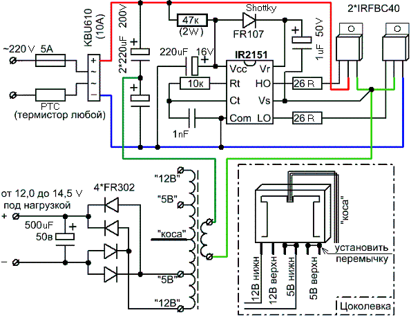 Találtam itthon egy kicsi kompakt bedobozolt tápot. Arra gondoltam, hogy a műhelyben lévő autórádiómat erről el tudnám üzemeltetni, és nem kéne mindig lezsibbasztani a tartalék akksimat a rádiómmal. Ki próbáltam, működött. Az 5V-os kimenetén lévő visszacsatolást át méreteztem és átépítettem a 12V-os részre. Tök jó is volt, de hangos volt a trafó. Gondoltam szétszedem, és letekerem róla a -12V-os, és a +12V-os tekercset. mert azok csak 2 szállal vannak meg tekerve. Az 5V-os meg 5 szállal. Tehát ha rátekerek 5 szál huzalt, hogy kiegészítsem az 5V-ot 12V-ra, akkor jobban fogja bírni. Mivel légréses volt, könnyen szétjött. Akkor vettem észre, hogy ripityára volt törve a mag, csak a sárga szalag tartotta össze. Így meg állt a projekt. Mielőtt szétszedtem volna meg mértem a primer tekercs induktivitását, biztos ami biztos alapon. Jól tettem ezek szerint. Mondjuk lehet be kéne tenni helyette egy másik trafót, de akkor át kell hekkelni a nyákot. Itt egy hasonló felépítésű táprajz, mint az enyém.