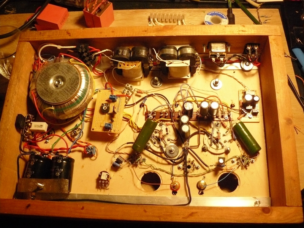 Tovább haladtam a GU50SE-vel. Tegnap 80%-ban átdrótoztam és bár még mindig kicsit kaotikus, kezd elfogadható eredményt produkálni. Üres bemenettel sajnos még gerjed, de ha rá van dugva valami, teljesen csendben van. Tegnap a börzén vettem két orosz 680nF/630V-os kondit (tán olajpapír?). Eredetileg riaa kicsatoláshoz szántam de beraktam ide. A bemenet direktcsatolt lett és kikötöttem a potmétert is.