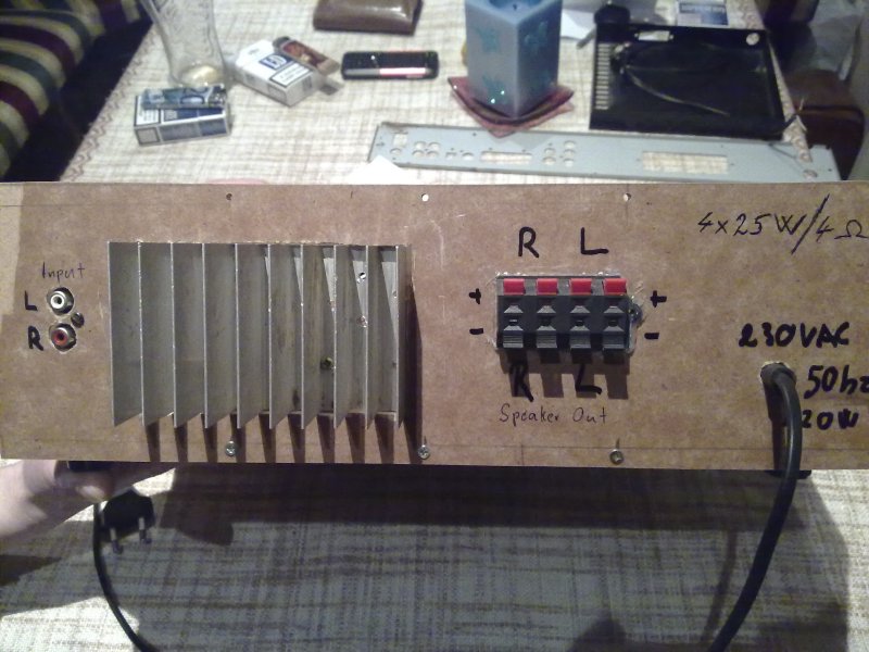 Elkészült keresztapám erősítője. Nem egy nagy valami, de neki elég lesz a mülyebe zenét hallgatni. Nem a legjobb a képek minősége, de szerintem a lényeg látszik.